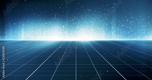 Futuristic digital grid and particles abstract cyber technology environment background. 3D Illustration.