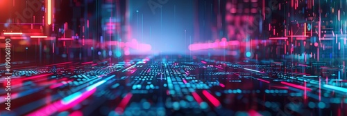 Futuristic Digital Highway with Neon Lights - This abstract image portrays a digital highway with glowing neon lights, symbolizing the fast-paced nature of technology, data flow, connectivity, and pro