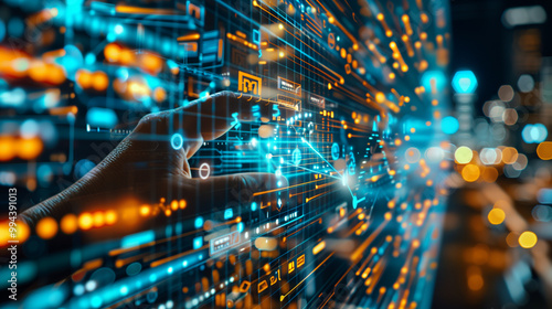 Futuristic Digital Interaction, Hand touching internet particles