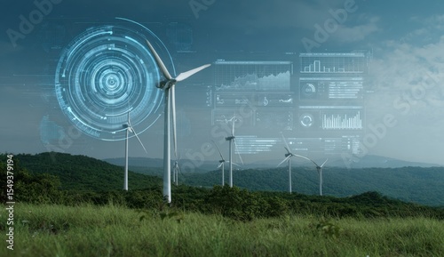 Futuristic digital interface overlays a serene wind farm, symbolizing advanced renewable energy monitoring.
