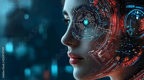 Futuristic digital interface showcasing a high tech biometric facial recognition identification and authorization system for secure identity verification and KYC approval