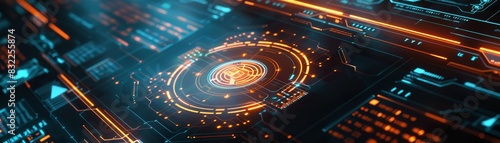 Futuristic digital interface with glowing blue and orange elements, symbolizing advanced technology and data processing.