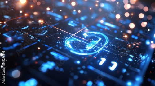 Futuristic digital interface with glowing circular symbol, data streams, and bokeh lights.
