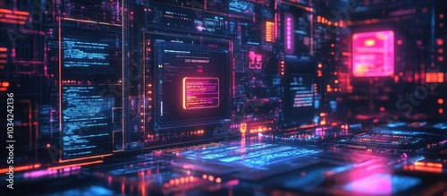 Futuristic digital interface with glowing neon lines, code, and data displays in a dark background.