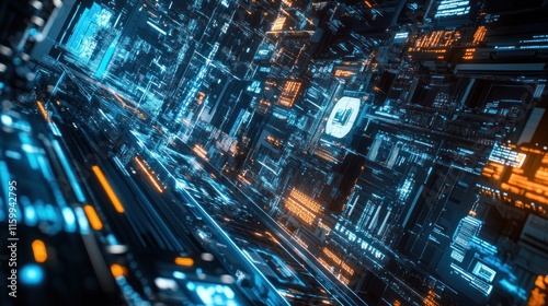 Futuristic digital landscape with glowing circuitry.