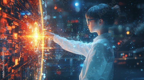 Futuristic Digital Learning Concept with Student Interacting with Virtual Interface in High-Tech Environment