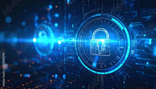 Futuristic digital lock symbolizing cybersecurity and data protection in a high-tech virtual environment.