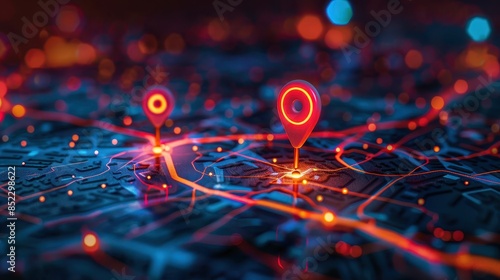 Futuristic Digital Map with Glowing Location Pins in Neon Colors