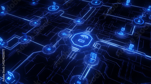 Futuristic digital network with glowing circuits and security icons in blue tones.