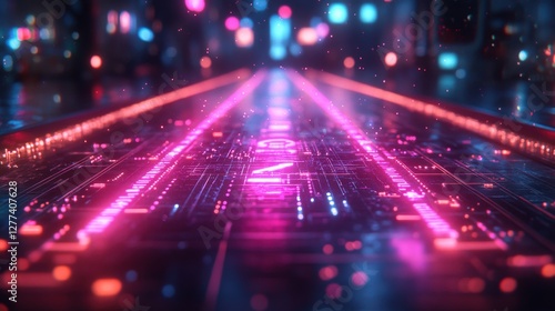 Futuristic digital pathway illuminated with vibrant neon lights and abstract patterns