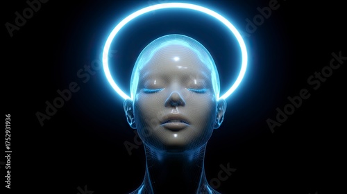Futuristic Digital Portrait with Glowing Halo and Serene Expression