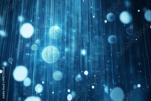 Futuristic Digital Rain Cascades Over Floating Geometric Shapes in a Techno Space