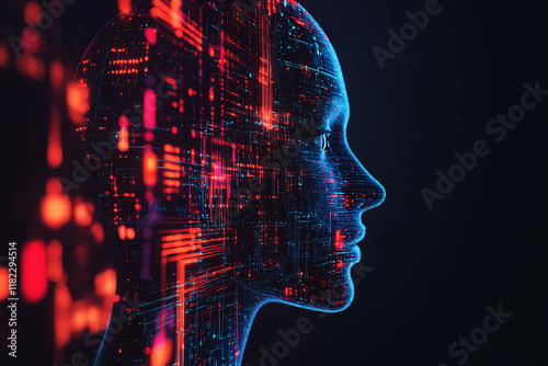 futuristic digital representation of a human head and upper body, composed of glowing circuits and networks, symbolizing artificial intelligence and advanced technology