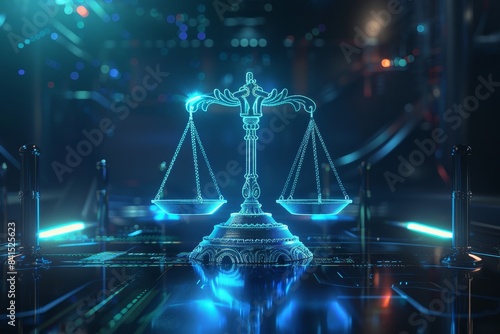 Futuristic digital scales of justice with a holographic interface, empty background space, Cyberpunk, Blue tones, 3D render, Legal tech