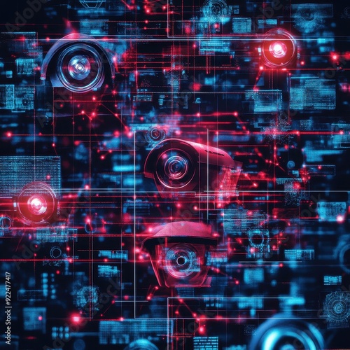 Futuristic digital security system concept with interconnected surveillance cameras and data visualization.