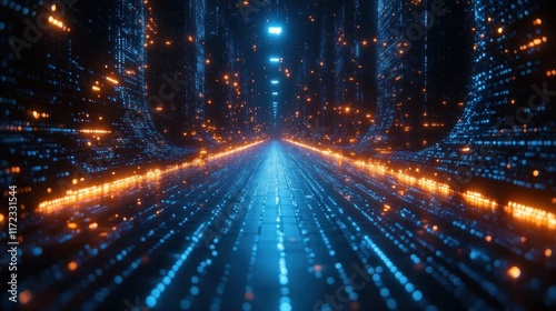 Futuristic digital tunnel illuminated by glowing blue and orange lights