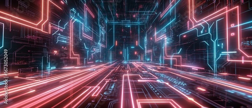 Futuristic digital tunnel: neon red and blue lines illuminate data flow.
