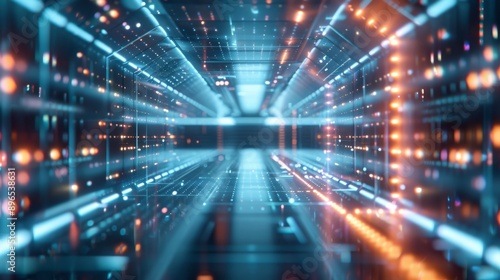 Futuristic digital tunnel with vibrant light beams and glowing lines, representing technology and speed.