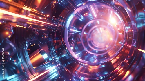 Futuristic digital tunnel with vibrant lights and colorful reflections, creating a dynamic and sci-fi inspired visual effect.
