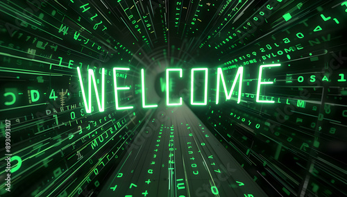 Futuristic digital welcome sign with glowing green text and data streams in a virtual environment, symbolizing technology and innovation.