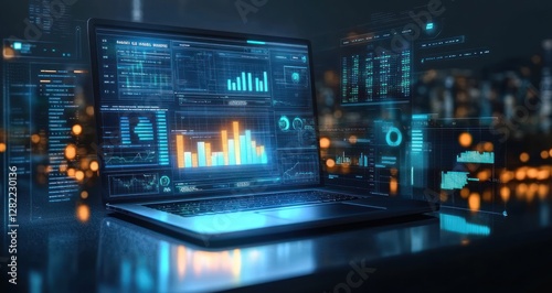 Futuristic Digital Workspace with Holographic Graphs and Financial Data Analysis