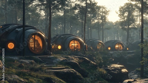 Futuristic Dome Homes in a Sunrise Forest