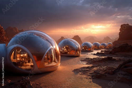 Futuristic domes nestled in a desert landscape at sunset, showcasing unique architecture and innovative design