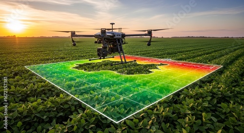 Futuristic Drone Technology Mapping a Vibrant Agricultural Field at Sunset