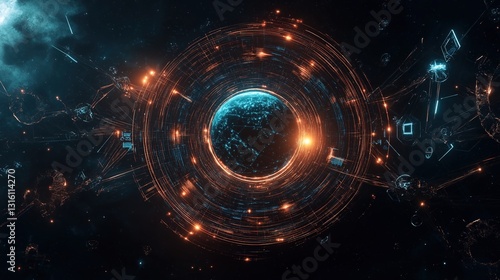 Futuristic Earth-centered network with glowing crypto nodes and IoT connections, symbolizing global digital connectivity.