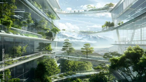 Futuristic Eco-Friendly Cityscape with Lush Greenery and Glass Buildings