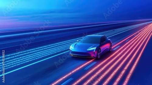 Futuristic electric vehicle speeding along illuminated highway in vibrant blue and red light streaks at dusk or dawn