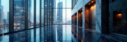 Futuristic elevator inside a skyscraper made of glass and steel, glass, steel