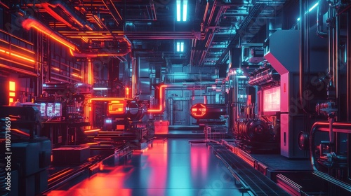Futuristic factory interior with neon lighting, complex machinery, and reflective floors.