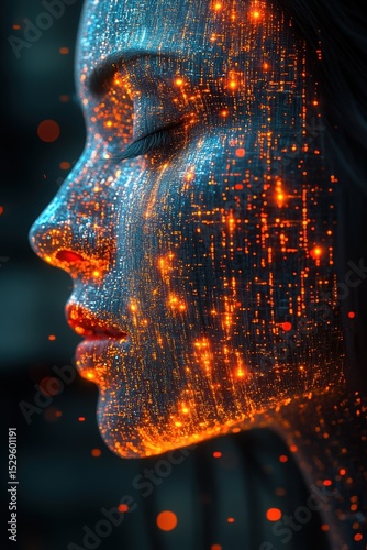 Futuristic female face with glowing digital data matrix in profile view, adult girl portrait