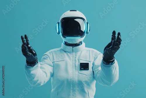 Futuristic figure in white suit and helmet with raised hands symbolizing the exploration of advanced technology robotics and space in a sleek sci fi inspired world