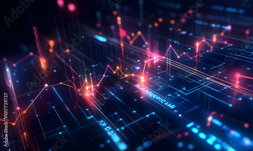 Futuristic financial dashboards and luxury business charts with glowing neon lines, gold accents, and connected nodes for corporate branding.