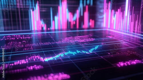 Futuristic financial data visualization with colorful charts and graphs representing market trends and analysis.