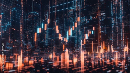 Futuristic financial market data visualization displaying dynamic candlestick charts and fluctuating graphs against a night skyline. Ideal for finance presentations, trading analytics