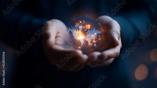 Futuristic financial stock market data hologram in businessman’s hand, technology and economic growth concept