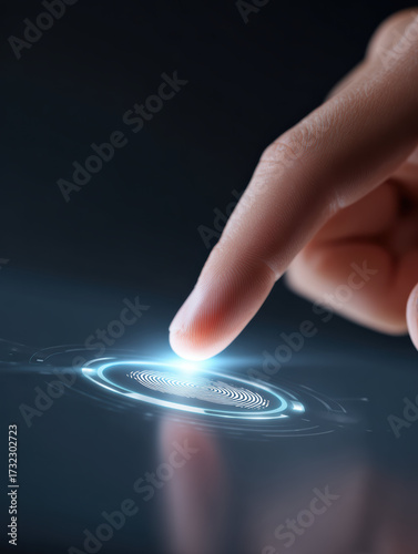Futuristic finger unlocking high security system with digital fingerprint scan. Concept of access, biometrics, identity verification, technology and protection on modern touchscreen