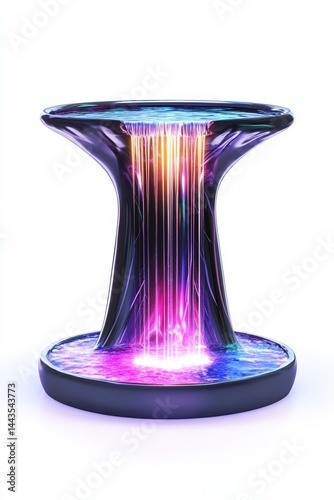 Futuristic fountain with curved glossy structure and vibrant multicolor water streams glowing in neon hues