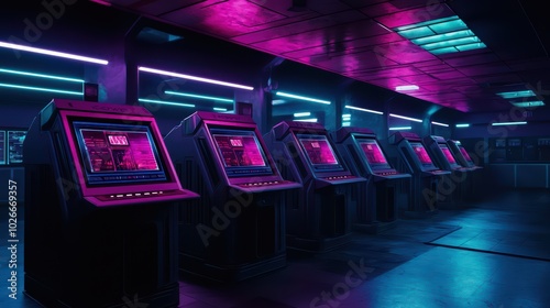 Futuristic gaming machines illuminated with vibrant neon lights in a high-tech environment.