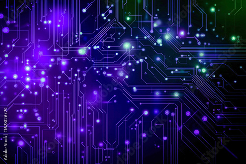 Futuristic Glowing Circuit Board Background with Purple and Gold Lights Technology Network
