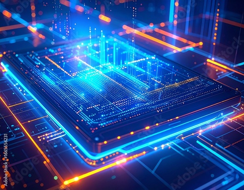 Futuristic glowing circuit board with vibrant blue and orange light trails, symbolizing technology, digital innovation, and high-speed data connections.