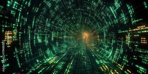 Futuristic glowing digital tunnel with green and orange matrix-like code forming a circular passageway with depth and technological energy