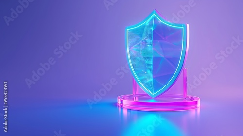 Futuristic glowing neon shield symbolizing cybersecurity and digital protection, set against a modern purple background.