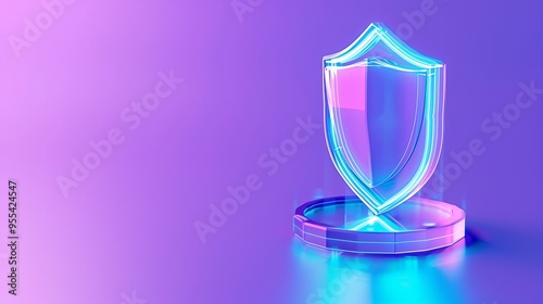 Futuristic glowing shield in neon blue and purple light, symbolizing advanced security and protection. 3D-rendered concept with modern aesthetics.