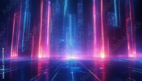 Futuristic glowing vertical light beams in pink and blue hues reflecting on a glossy surface in a digital abstract space