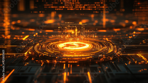 Futuristic golden Bitcoin symbol glowing in a digital network, surrounded by flowing lines of code and data, showcasing advanced cryptocurrency technology and modern digital infrastructure.