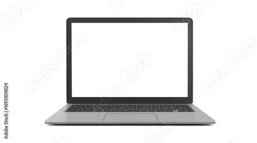 Futuristic gray laptop (blank white screen, front view) + isolated Lewis & Clark globe—white background, vector illustration/3D rendering; mockup template for design presentations, web/mobile apps